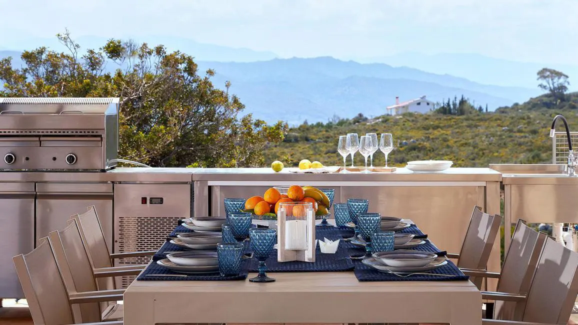 This is the villa’s main outdoor living area, a spacious and beautifully designed setting that opens up to panoramic views across Souda Bay. Generously sized, the space is thoughtfully arranged into three distinct zones for cooking, dining, and relaxing. At its heart lies a fully equipped covered outdoor kitchen featuring a large gas BBQ, sink, and refrigerated unit.